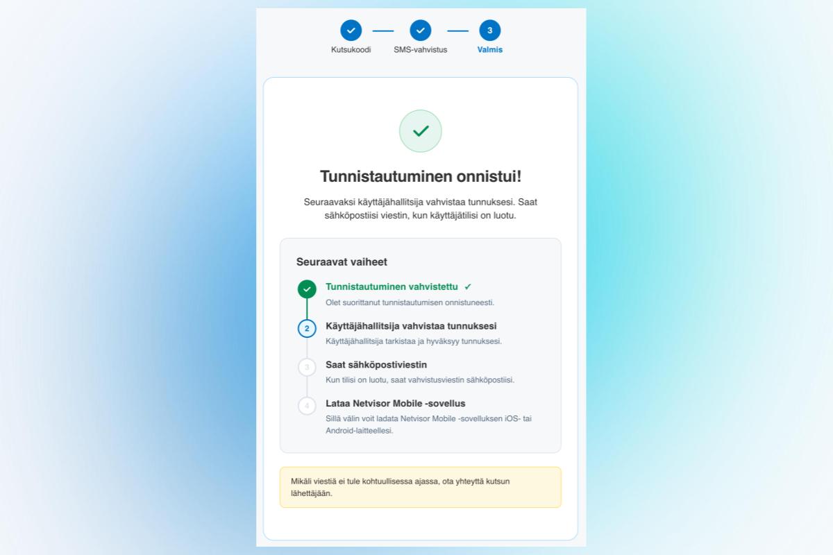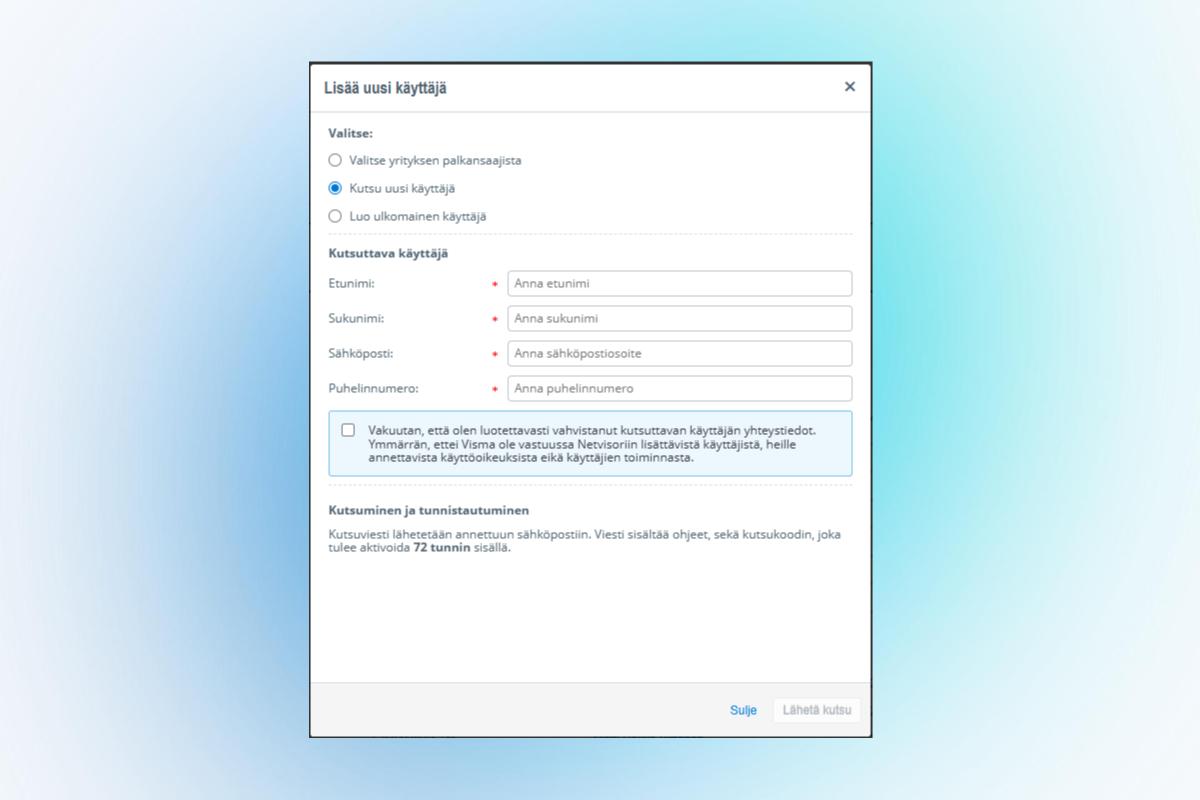 1.4.2026 julkaisemme täysin uudistuneen käyttäjän kutsumisen Netvisoriin, joka siirtää painopisteen manuaalisesta tietojen syöttämisestä moderniin käyttäjän kutsuprosessiin. Uudistus koskee vain suomalaisten käyttäjien kutsumista. Ulkomaalaisten käyttäjien kutsuminen säilyy ennallaan.
