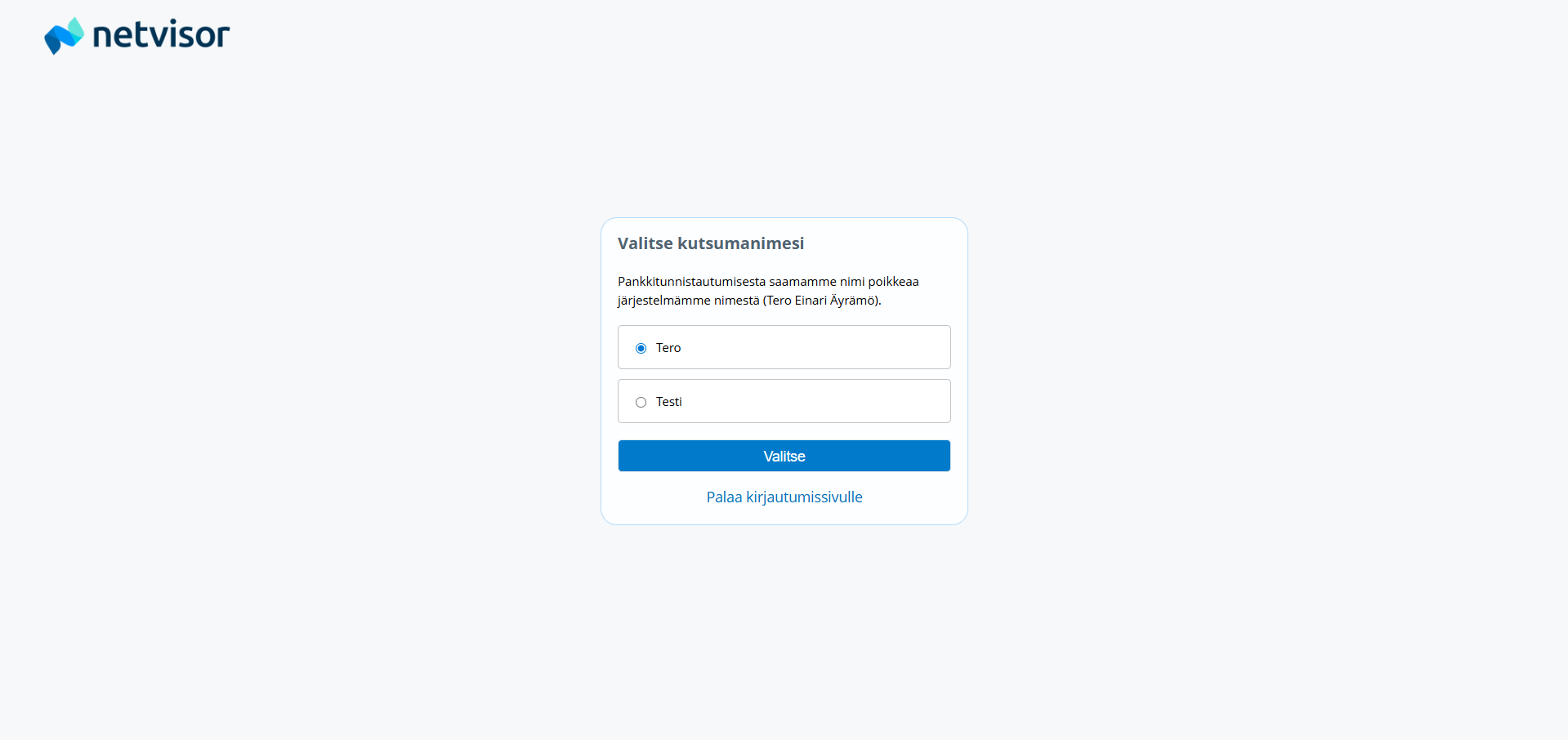Jos kirjautuvan käyttäjän etunimi ei täsmää käyttäjälle Netvisorissa annettuun etunimeen, saa kutsuttu käyttäjä kirjautumisen yhteydessä ilmoituksen kutsumanimen vahvistamisesta. Sukunimitieto muuttuu aina automaattisesti. Nimitieto saadaan vahvan tunnistautumisen kautta, eli jos näkymässä näytetään väärä nimi, tulisi korjaus tehdä tunnistautumiseen käytetyn pankin järjestelmässä. Valitse näkymässä käyttämäsi kutsumanimi. Nimeä ei voi muuttaa jälkikäteen, joten jos valitset väärän kutsumanimen, olethan yhteydessä Netvisor-tukeen. Mikäli vahvan tunnistautumisen kautta saatava nimitieto on kirjoitettu suurin kirjaimin (CapsLock) muuttaa tämä käyttäjän nimen Netvisorissa vastaamaan tätä tietoa. Tähän tulemme tekemään muutoksen, jotta jatkossa kirjoitusasu ei muuta nimitietoa Netvisorissa, mikäli nimi itsessään ei eroa Netvisorissa käyttäjän nimitiedosta.