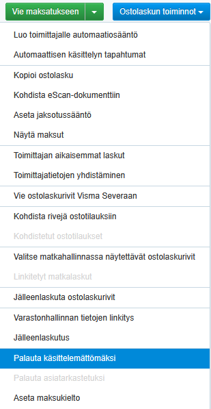 Om du vill redigera en godkänd faktura måste fakturan återställas till obehandlad eller sakgranskad via menyn "Inköpsfakturans funktioner". Om du har bokförarrollen (KP) kan du redigera fakturan även efter godkännande (förutom att du inte kan redigera betalningsvillkoret eller förfallodagen). Om en godkänd faktura ska tas bort måste den återställas till obehandlad och sedan kommer alternativet "Ta bort faktura" att visas i menyn "Inköpsfakturans funktioner".